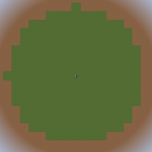 The extent of random tick, shown with the spread of grass on clay. Notice how the grass follows chunk boundaries. The red and blueish arrows in the heart mark the +X and +Z directions. The thespian is in the (seven,7) location in a chunk, slightly towards the north-west corner of the chunk, which ways the centers of two chunks on the edge in the -10 and -Z directions are brought within the 128-block radius, thereby allowing chunk tick processing. This is confirmed by the two one-chunk grass protrusions on the northern and western edges. (North is up)